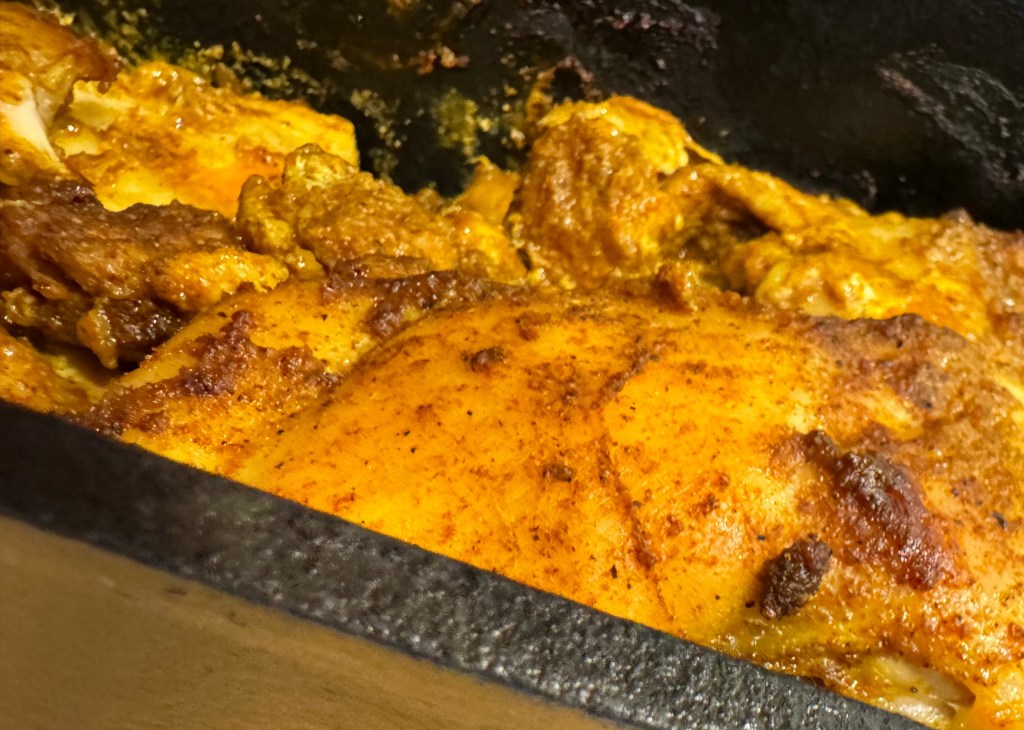 - Roast the marinated chicken in the preheated oven for one hourcovered. At the halfway mark, strain any liquids that accumulate in the pan.