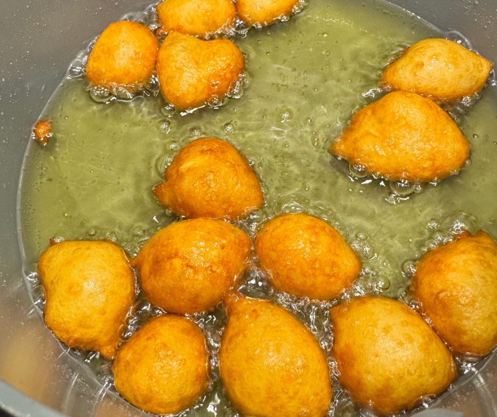 • Carefully pipe or drop small balls of batter into the hot oil.