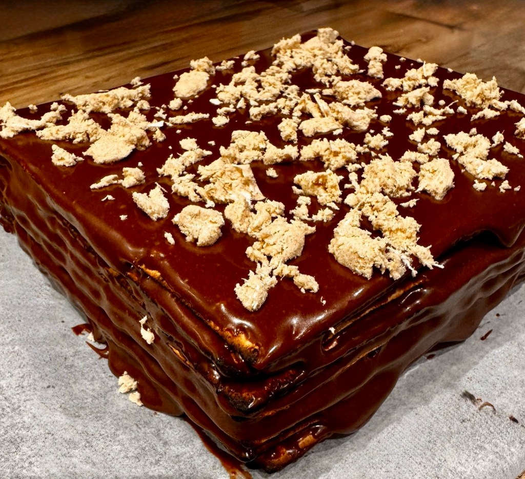 Spread cream over the top of each layer. Repeat until all cream is used.